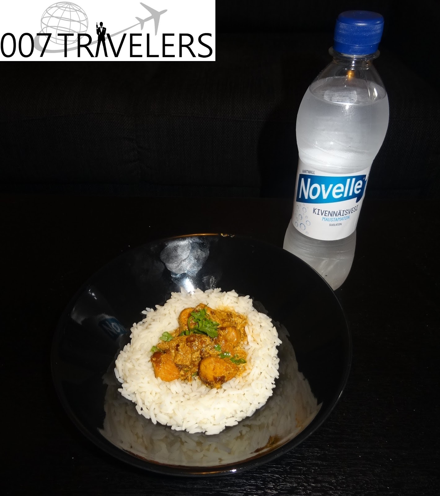 007 Food: Chicken curry with rice, served with bottled sparkling water