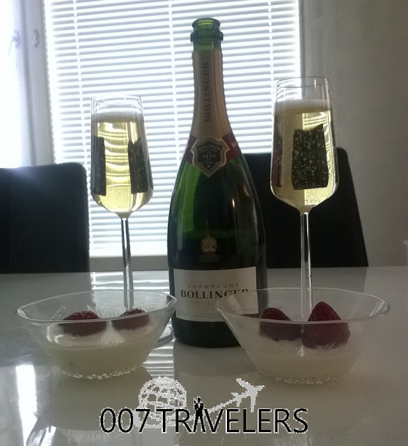 007 Food: Salad by P.J. Clark, cold pheasant, strawberries and cream with champagne