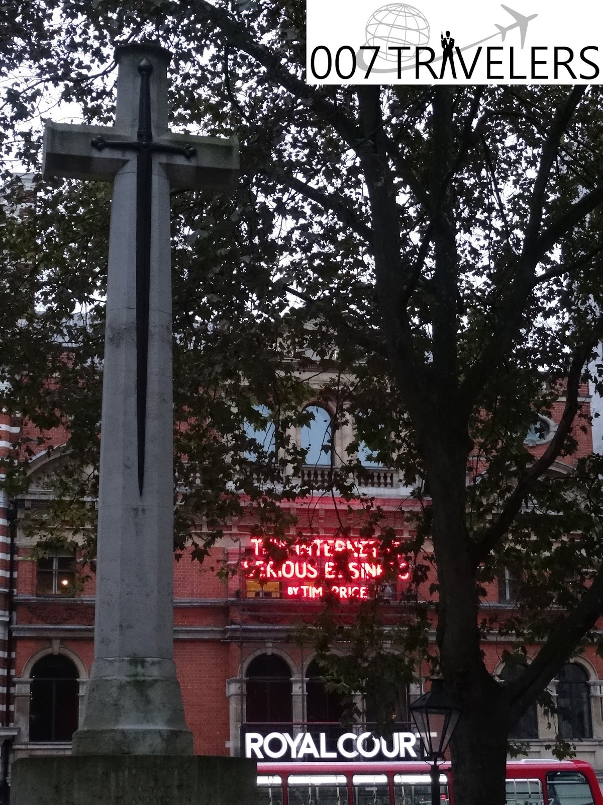 “Unfortunately, the author doesn’t specify the precise location of the sign. Presumably, it would have been mounted on one of the buildings behind, and therefore partially obstructed by, the Royal Court Theatre, then newly rebuilt, and/or the tube station.”